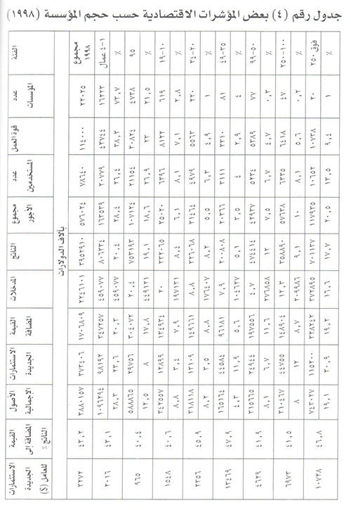 وتهيمن المؤسسات الصغيرة عددياً في الصناعة حيث تبلغ نسبة المؤسسات التي تستخدم أقل من 5 عمال 73,7%، والتي تستخدم أقل من 10 عمال تستحوذ على 95%. أما المؤسسات التي تستخدم أكثر من 100 عامل فلا تشكل أكثر من 1%. ثم أن المؤسسات التي تستخدم أقل من 10 عمال تضم 65% من قوة العمل وتتحمل 55% من الأجور. أما في العام 1994 فإن 91% من المؤسسات شغلت أقل من 10 عمال (أي ما يزيد 57% منهم وتحملت 38% من الأجور100) (أنظر جدول رقم 4). وهكذا فإن المعدل الوسطي للعاملين في المؤسسة الصناعية قد انخفض من 6,4 عامل سنة 1994 إلى 5,2 عام 1998. إن هذا الواقع يعود لكون أكثر من 83% من المؤسسات الصناعية شركة فردية (أنظر الجدول رقم 2).