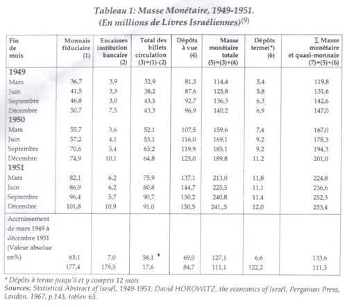 Les statistiques font donc ressortir un accroissement substantiel de la masse monétaire durant les premières années d’existence d’Israël. Cet accroissement résultait de l’incapacité de l’économie israélienne à fournir une épargne volontaire suffisante pour financer des investissements approchant le tiers du revenu national.