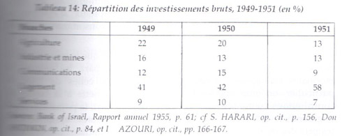 Durant la période 1948-1951, on a tenté de résoudre la difficulté de l’intégration des immigrants par l’inflation et la généralisation des contrôles, de telle sorte que l’économie fut peu à peu retranchée du monde extérieur. En plus, il fallait construire pour loger les nouveaux arrivés et une forte part de l’investissement dut être détournée, non seulement sur la consommation courante mais aussi sur la construction résidentielle; elle atteignit en 1951 le maximum de 51% des investissements(56).