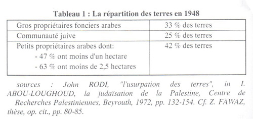 sources : John RODI, "l'usurpation des terres", in I. ABOU-LOUGHOUD, la judaïsation de la Palestine, Centre de Recherches Palestiniennes, Beyrouth, 1972, pp. 132-154. Cf. Z. FAWAZ, thèse, op. cit., pp. 80-85.