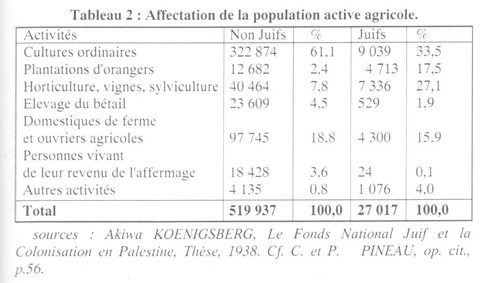 D'après le tableau no2, ci-dessus, on voit donc que moitié moins de juifs que de palestiniens s'adonnent à la culture de subsistance (céréales, légumes, etc.), tandis que 44,6 % de la population agricole juive est occupée dans les produits d'exportation (oranges, vigne, horticulture) contre 10,2 % de la population agricole palestinienne.