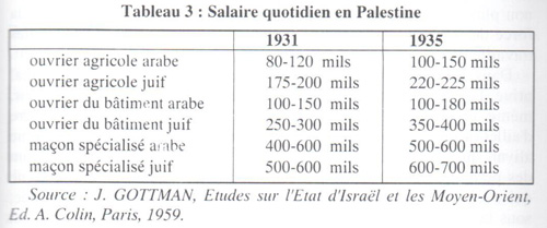 Désormais, l'ouvrier juif percevra un salaire supérieur à celui de l'ouvrier palestinien. Cette politique des salaires (Tableau 3) pose quelques problèmes à la Histadrouth; certaines entreprises en tirent parti en faisant jouer la dynamique ordinaire - dans les rapports de production capitalistes - de la concurrence: elles préfèrent employer la force de travail palestinienne. Certaines colonies doivent se soumettre pourtant en partie à la pression de la Histadrouth. Les incidents de Petha Tikva (la plus ancienne des colonies juives en Palestine), en 1927, témoignent des rapports violents engendrés par la mise en place du "travail juif": "Les planteurs de cette colonie avaient vendu leurs récoltes d'oranges sur pieds aux arabes; ils se refusèrent alors à employer à salaire égal des chômeurs de Tel-Aviv; les "sans-travail" juifs ripostèrent en commettant des actes de violence qui furent réprimés par la police anglaise. Un jugement eut lieu; les chômeurs juifs furent condamnés à des peines de prison légères. Le tribunal déclara en outre que les colons en préférant à des chômeurs sans pain, des arabes qui avaient de quoi s'occuper ailleurs, méritaient d'être moralement condamnés. La pression publique s'ajoutant à cet attendu du jugement, les colons de Petah Tikva durent promettre que désormais ils prendraient parmi les juifs 50 % des ouvriers travaillant à la "récolte". De tels évènements ne sont pas rares. Outre l'imposition du "travail juif", on tend à détourner la production des circuits de distribution arabes vers les circuits de distribution sionistes. Cette réorientation se réalise parfois plus ouvertement: on associe au boycott le sabotage de la production indigène. La direction sioniste n'hésite pas non plus à indemniser au besoin les employeurs afin qu'ils utilisent la force de travail juive, tentant ainsi de mettre fin à la concurrence des travailleurs palestiniens.