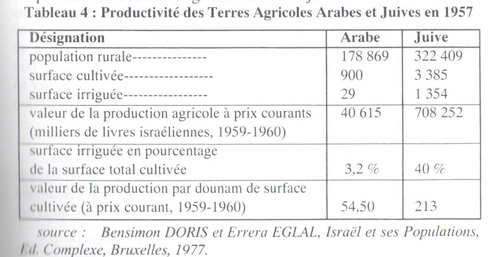 A la lumière de ce tableau, nous pouvons faire quelques remarques sur la situation comparée des deux secteurs juif et arabe: alors que la population rurale arabe représente plus de la moitié de la population agricole juive, cette dernière possède quatre fois plus de terres cultivées. De plus, si près de la moitié de la surface cultivée juive profite de l'irrigation, cette proportion pour les terres arabes est dérisoire. Ces conditions défavorables pour la population palestinienne se répercutent dans la production: la valeur de la production agricole arabe représente 5,3 % de la production totale israélienne, alors que dix ans auparavant, cette proportion était de 8,2 %. Pourtant, dans une certaine mesure, la productivité de la terre arabe augmente par le contrecoup de la mécanisation. Mais la volonté délibérée du pouvoir israélien de ne pas laisser se développer une production arabe autonome ne fera qu'accroître le décalage entre la productivité de l'agriculture arabe et celle de l'agriculture juive.