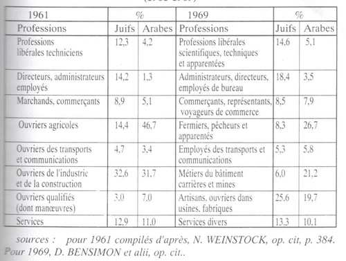 En 1961, il est déjà possible de constater la forte concentration de la main d'oeuvre arabe dans l'agriculture, l'industrie et la construction. Sa participation aux autres secteurs restait dérisoire. A cette époque, le secteur le plus important est l'agriculture, où le taux de la population agricole arabe, maintenant salariée, est considérable (46,7 %); la proportion de la main d'oeuvre arabe est légèrement supérieure à celle de la main d'oeuvre juive dans l'industrie et la construction, ouvriers qualifiés compris (on remarque que ce secteur est très important dans la population arabe). Par contre, le quart de la population juive occupe des emplois "nobles" (professions libérales, techniciens, directeurs, employés de bureau) contre 5 % seulement de la population arabe. Cette structure est comparable à celle des Noirs aux Etats-Unis ou -pour rester plus près de notre sujet- à celle des juifs sépharadites.