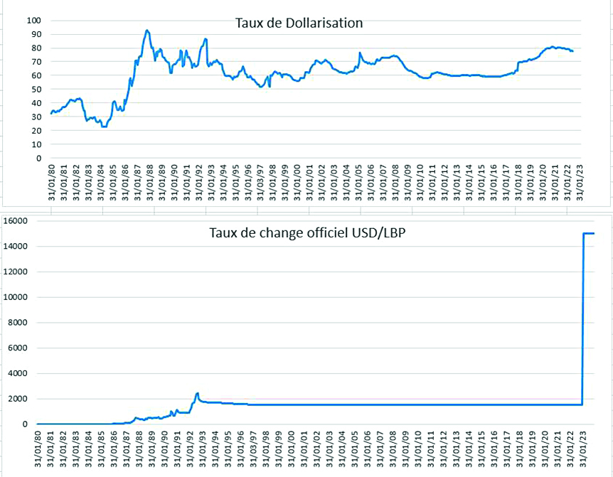 Avant 1993, le Liban appliquait un régime de flottement libre du taux de change. Durant la période guerre libanaise (1975-1992), la crise monétaire s’est traduite par un taux de dollarisation des dépôts au Liban a atteint son apogée de 92% fin 1987 suite à une hyperinflation de 487% et une sévère dépréciation de la livre libanaise, pour retomber à 68% en 1992, deux ans après la fin de la guerre. La dollarisation des crédits passe de 82% en 1989 à 85% à fin 1990 et 91.5% à la fin de 1992. En 1992, le Liban délaisse le régime de flottement libre du taux de change pour adopter in régime de parité glissante prospective permettant de rabaisser le taux de change USD/LBP de 2850 à 1507.5 en 1997 selon les statistiques de la Banque du Liban. Au Liban, la BDL a même crée en 1994 une chambre de compensation des chèques en USD et a accéléré l’emprunt public en USD depuis les années quatre-vingt-dix, a rempli les distributeurs automatiques de billets en USD.