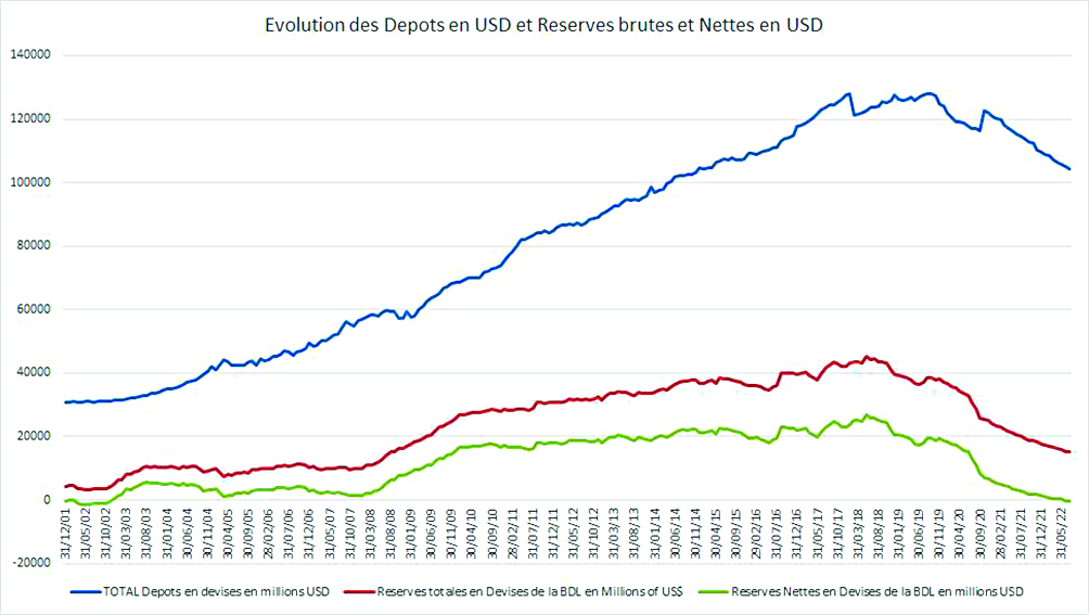 Ainsi, les billets de LBP en circulation seront couverts avec moins d’1 milliard USD. Les Dépôts en USD jusqu’à 100,000 USD selon le plan gouvernement libanais sont de 19 milliards USD et exigent des Réserves Obligatoires (14%) de 2.66 milliards USD. Les dépôts restants en USD ne dépassent plus l’équivalent de 3.46 milliards de fresh USD et nécessitent 1.732 milliards USD de réserves obligatoires. Les Dépôts en LBP ne dépassent plus l’équivalent de 0.475 milliards USD et nécessitent 0.06 milliards USD de réserves obligatoires. Ainsi, le total nécessaire pour couvrir la base monétaire ne dépassera plus 5.5 milliards USD de réserves internationales. Sachant que le bilan de la BDL de juin 2023 montre que les réserves en USD restantes à la BDL sont de 7.3 milliards USD, en plus de 5,03 milliards USD d’euro bonds dont l’État libanais a annoncé le défaut de paiement, ainsi que des réserves en or de l’ordre de 16,65 milliards USD selon le même rapport.