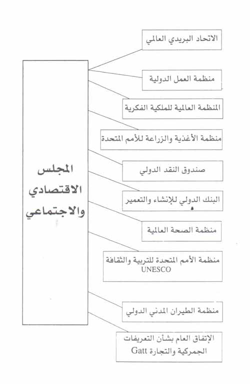 بعض المنظمات الدولية المتخصصة تتبع في أعمالها الجمعية العامة للأمم المتحدة, وبعضها الآخر يتبع المجلس الاقتصادي والاجتماعي (كما يشير الرسمان البيانيان) ([5]). وهي تتمتع بالصفة الدولية لأن عضويتها مفتوحة أمام كافة الدول, وتتخطى في نشاطاتها الأقاليم الجغرافية المحدّدة.