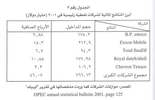 وللتدليل على اهمية هذه الشركات، مجددا"، يتبين ان حجم مداخيلها يمثل، في 2001، نحو 91% من حجم الناتج القومي (839.6 مليار دولار ) ونحو 243% من حجم صادرات (314 ملياراً) دول "أوبيك" مجتمعة.