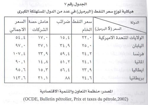 وتعكس هذه الحقيقة جانبا" من سوء توزيع عائدات النفط بين الدول المنتجة وسائر أطراف السوق. وتبيّن هيكلية الأسعار ان هامش ارباح الشركات يصل الى أضعاف كلفة الإنتاج، وان هذه الكلفة تتراجع، خصوصاً مع إدخال تقنيات جديدة ومع توحد الشركات، في الدول الغنية بالمادة، خصوصاً وأن سعر النفط الخام يظل يمثل 25 الى 40 % من مستوى مبيع المشتقات النفطية المكررة في الدول المستهلكة الرئيسية[39].