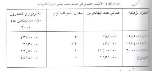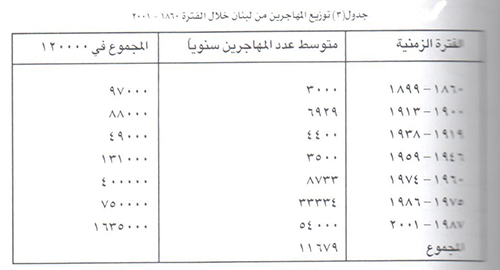 وانطلاقاً من معطيات الجدول السابق يتبين انه خلال الفترة 1975 1987 غادر لبنان حوالي 400 الف نسمة, في حين ان عدد المغادرين خلال العقدين والنصف الاخيرين, من القرن العشرين (1975 - 2001) بلغ مليون ومائة وخمسون الف مهاجر, أي أنه غادر لبنان منذ عام 1987 وحتى عشية الالفية الثانية حوالي 750 الف نسمة, بمتوسط سنوي بلغ 54 ألفاً. في حين ان متوسط عدد المهاجرين للفترة السابقة 1975 - 1987 بلغ حوالي 33,8 الف نسمة سنوياً.