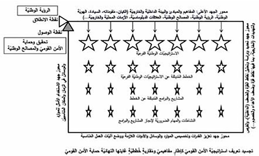 إنّ إعدادَ السياسات العامّة الصالحةِ لزمنيْ السلم والحرب، وفي المجالات السياسيّة، الاقتصاديّة، الاجتماعيّة، والعسكريّة، يستوجبُ تحضيرًا يتمثّلُ بالتخطيطِ الاستراتيجيّ الشامل الطويل الأمد. ويُمكنُ لهذه الغاية اتّباعُ منهجيّةٍ مُنظّمةٍ تبدأُ بصياغةِ استراتيجيّة للأمن القوميّ، يُمكنُ تعريفها على أنّها إطارُ عملٍ مفاهيميٍّ شاملٍ، تُبرِزُ الدولةُ من خلالها أوّلويّاتها على صعيد حماية الأمن القوميّ، وتَوَجُّهاتها الاستراتيجيّة، وأهدافَها المستقبليّة، وتُحدِّدُ فيها مصالحَها الوطنيّة، وتَرسُمُ الطُرُقَ وتُحضّرُ الوسائل وتُخصِّصُ الموارد اللازمة لتحقيقها. وبعد أن تُعَمَّمَ على الوزارات والأجهزة والمؤسّسات والإدارات المعنيّة، ينبثقُ عنها استراتيجيّاتٌ وطنيّةٌ فرعيّةٌ وخططٌ وبرامج تتوافق مع المصالح الوطنيّة وتهدف إلى تحقيقها وحمايتها، إذ يُسهِمُ تنفيذُ هذه الاستراتيجيّات، في ظلّ التعاون والتنسيق وتضافر الجهود، في ضمان حماية الأمن القوميّ. وعادةً، يضعُ مجلسُ الأمنِ القوميّ أو ما يُشبهُهُ أو لجنةٌ مُتخصِّصةٌ، استراتيجيّة الأمنِ القوميّ (الوطنيّ)، التي تَصدُرُ عن السلطة التنفيذيّة السياسيّة العليا15.