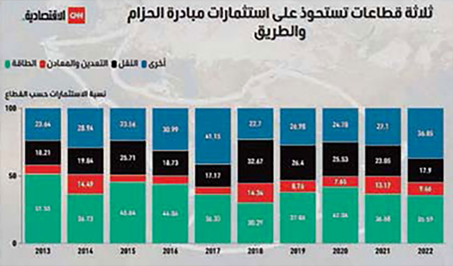 ووفق التقرير السنوي لمركز التمويل والتنمية الأخضر GREEN FINANCE AND DEVELOPMENT CENTER، بلغ إجمالي استثمارات الصين في مبادرة الحزام والطريق منذ العام 2013 حوالي 962 مليار دولار أميركي، أي ما يقارب تريليون دولار، وشملت هذه الاستثمارات قطاعات متنوعة، بما فيها النقل والطاقة والمعادن وغيرها.