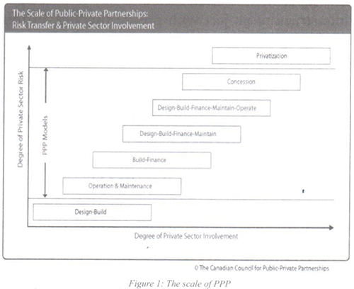 The following figure is a Canadian sample of PPP[5] classification and it shows a scale of PPP starting from the minimum level of private sector involvement to the maximum one which is privatization: