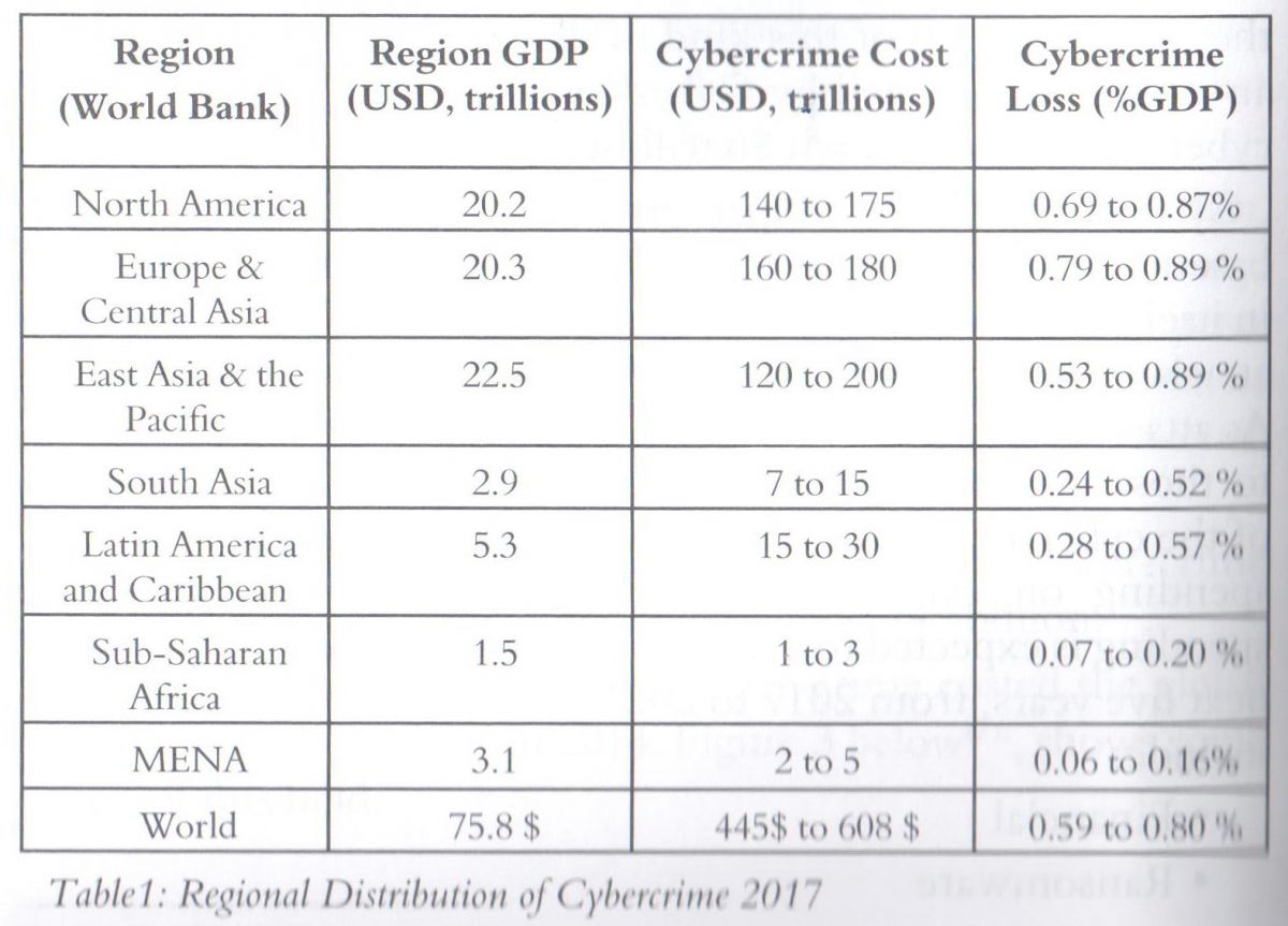 The cost of cyber-crime is distributed among all the countries of the world, no one is immune. Table 1 below shows variations by region that are linked to income levels and level of cyber-security maturity, the countries with greater losses are the richest ones.[28]