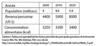 - Une demande interne en hausse (quantitative et qualitative): l’aspect quantitatif de la croissance de la demande alimentaire interne ne doit pas être occulté par le souci légitime de l’amélioration qualitative; la demande en céréales pour la consommation humaine pourrait croître de 10% au moins, alors que celle de la viande peut doubler sur 20 ans, la population augmentant de quelque 30% dans la même période[37].