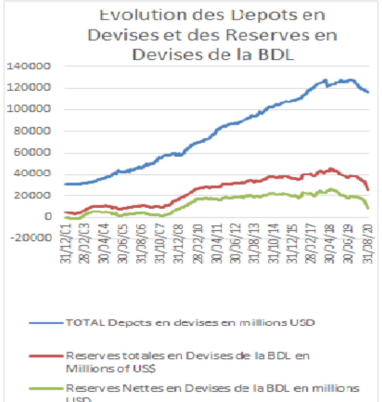 Depuis l’augmentation de la dollarisation à 86% suite à l’hyperinflation de 1987, la dollarisation s’est maintenue au Liban et n’a baissé que légèrement au-dessous de 70% pour raugmenter à plus de 76% aujourd’hui. Jusqu’avant l’éclatement de la crise en 2019, les dépôts en dollars avaient atteint l’ordre de 120 milliards de dollars, soit une fois et demi le PIB du Liban a cette période. Le secteur bancaire détenait des eurobonds de 15 milliards de dollars et gardait près de 70 milliards de dollars auprès de la BDL sous forme de réserves obligatoires sur les dépôts en devises étrangères (15% des dépôts en devises soit près de 18 milliards USD) et certificats de dépôt en dollars (estimes par Bloomberg à 52.8 milliards USD), alors que la BDL portait des eurobonds pour 5,7 milliards de dollars. La dollarisation déclenchée au Liban depuis les années 80 est toujours officieuse et partielle, mais la BDL a créé une chambre de compensation des chèques en dollar et permettait de remplir les Distributeurs Automatiques (ATM) par les deux devises, la LBP et l’USD.