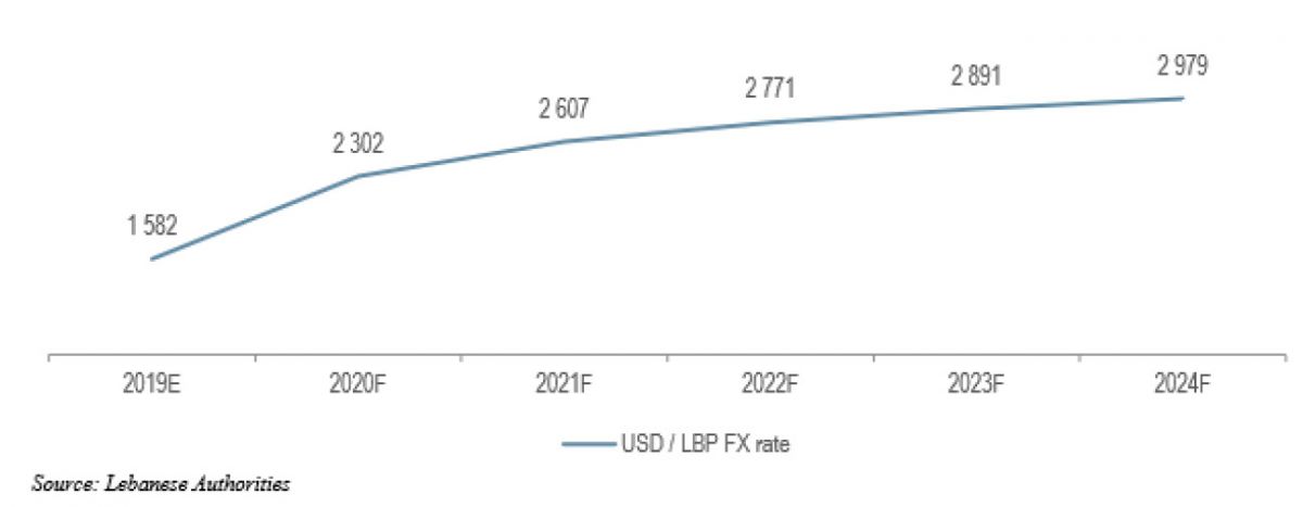 Les études actuelles ont indiqué, selon la méthodologie utilisée dans le plan, la surestimation précédente de la livre libanaise de 30% à 60%[16]. Cette dernière estimation a été calculée comme nécessaire pour combler l’écart de balance des paiements. Étant donné que la restructuration de la dette extérieure devrait contribuer à environ la moitié du déficit de financement extérieur, on estime que l’ajustement initial d’environ 30% du taux de change permettra une réorganisation harmonieuse du taux d’intérêt. Le différentiel d’inflation entraînerait une baisse du taux de change officiel de 50% à 60% d’ici 2024[17].